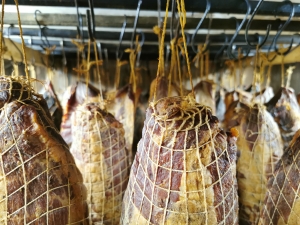 Schinkenspeck, Bauchspeck und Ossocollo reifen über den Winter. Auch den Lardo machen wir selbst.