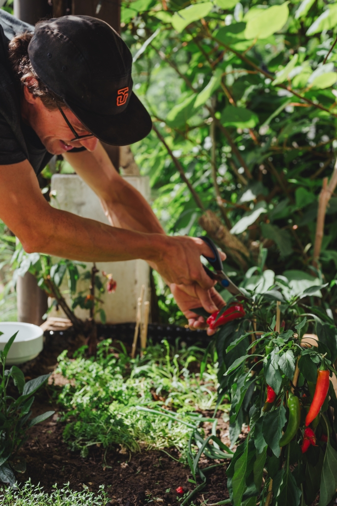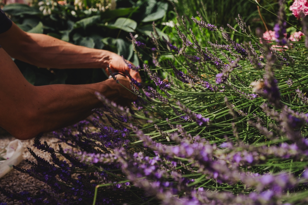 Eine Kräutervielfalt und Blüten sorgen für Duft und Dekor. Frisches Gemüse für die Jause und Walnüsse vom eigenen Baum.