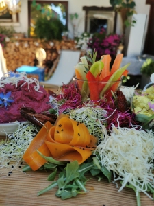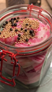 Senfkaviar mit eigenen Apfelessig I Löwenzahnkapern von der Wiese I Kiwi-Chili-Chutney alles vom Garten I veganer Zwiebelschmalz I Feilchen-, Chili-, Hibiskus- und Bärlauchsalz vom Garten bzw. Wald und natürlichem Steinsalz I Sprossen ziehen wir selbst.